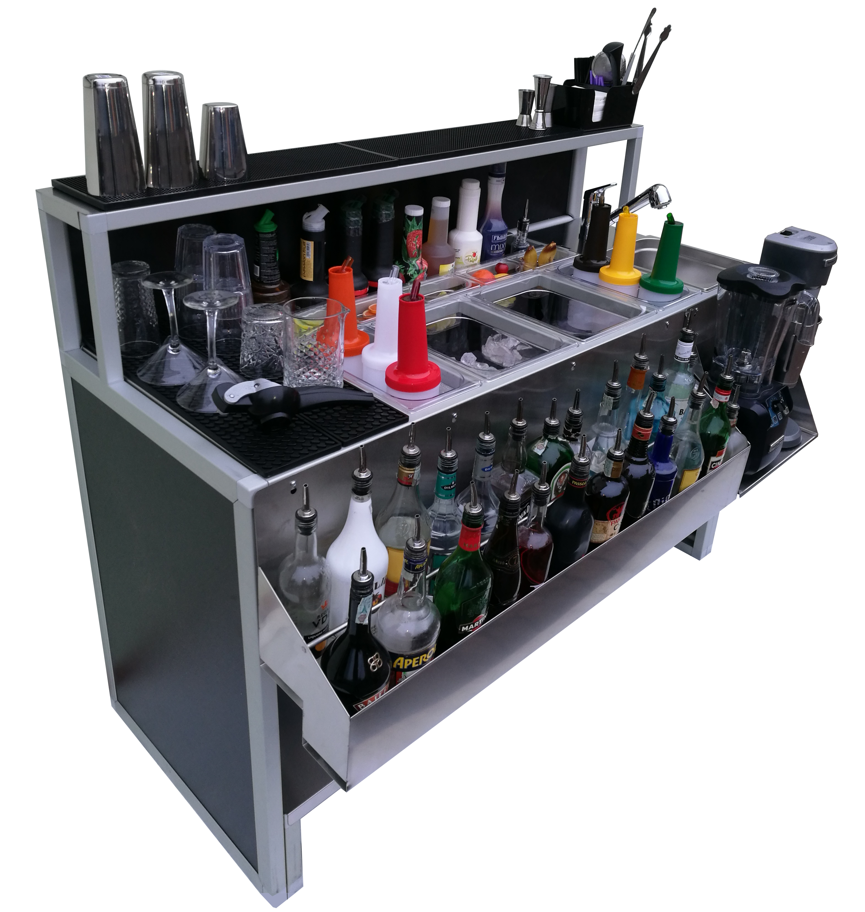 Notre station de bar la plus complète. En 150 cm d'espace, elle a tout ce dont vous avez besoin, y compris un évier et un robinet. Convient aux bars, restaurants, hôtels, services de restauration, établissements balnéaires et tout autre lieu, car elle peut être intégrée à un comptoir de bar existant. Peut être utilisée en extérieur car elle est entièrement détachable. Vous pouvez ajouter des options comme des roues avec freins et un sac trolley pour le transport.