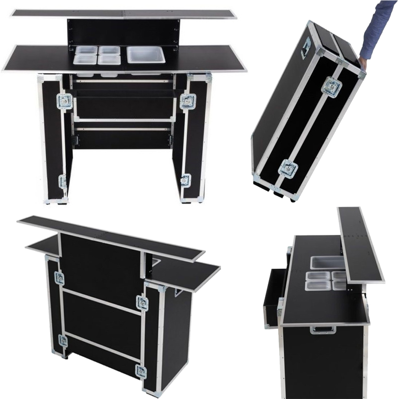 Poste de travail de bar portable transformable en une valise trolley. Une révolution pour le secteur des barmen ! Fabriqué en matériau de haute qualité, revêtu d'une surface phénolique qui le rend hydrofuge. Essentiel, sûr et fonctionnel, ce comptoir comprend également une station avec des contenants pour les fruits, la glace et un rack à vitesse d'une capacité d'environ 10 bouteilles.
