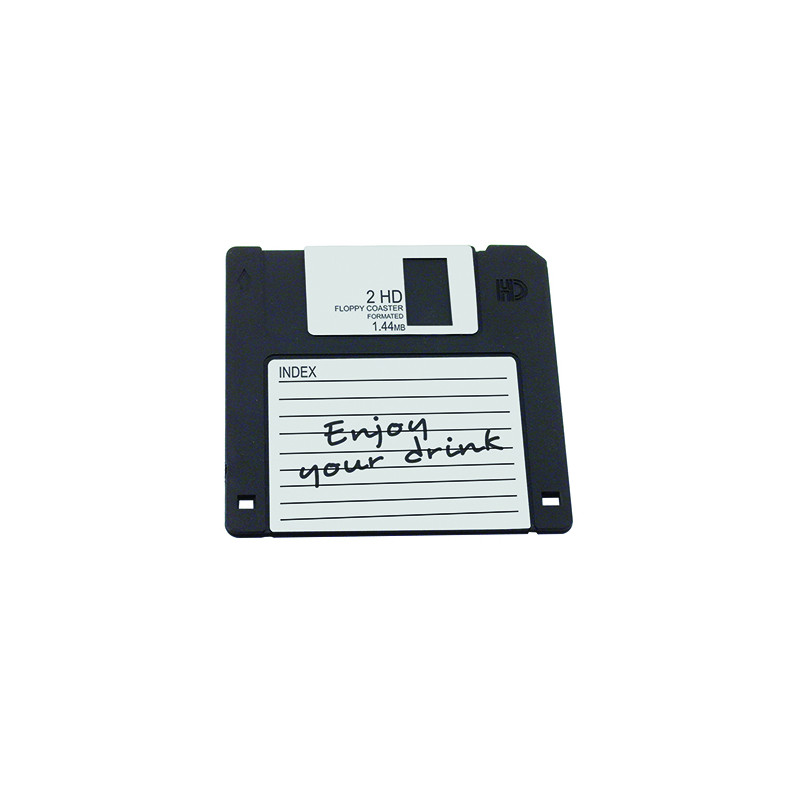 Sous-verre Floppy Disc en caoutchouc naturel à forme de disquette. Convient pour servir des cocktails spéciaux.